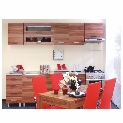 Kuchyne ponúkame od slovenského výrobcu DREVONA, kde máte možnosť výberu zo siedmych farebných prevedení: buk, dub, javor, jelša, orech, slivka alebo wenge. Kuchynské skrinky sú vyrobené z DTD laminovaná+0,5 mm ABS hrany. Spodné skrinky sú na pevných nožičkách, čo je výhoda upratania aj pod skrinkami. Výber vrchnej časti linky je s možnosťou niektorých skriniek presklených. Medzi spodnými skrinkami nájdete aj skrinku pre vstavanú rúru na pečenie a vrchnú platňu, tiež sú skrinky pre chladničku. Pre náročnejších je možné použiť aj rohové skrinky, ktoré dodávajú Vašej rohovej kuchyni eleganciu a štýl. Samozrejmosťou sú aj pracovné dosky v striebornej farbe v dĺžkach 30 - 300cm a kvalitný univerzálny nerezový drez.